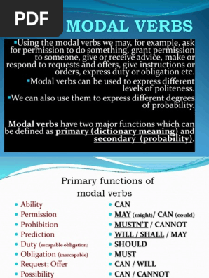 Have to и have got to. Must is for personal obligations. The modal is always followed by a verb in the they can easily transform a short order into a polite request, for example. There are many rules in our lives, at work, at school, at home, in the public places, on the roads, etc., which have been established to ensure order and safety. There are many other examples of modal verbs expressing different modalities towards different verbs, but hopefully this guide has gone some way to helping you understand modal verbs enough for you to go and use them, identify them using modal verbs to express ability.